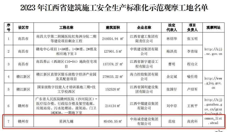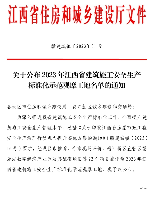 日前,赣州城投集团星洲九樾等2个项目获评2023年江西省建筑施工安全生产标准化示范观摩项目。