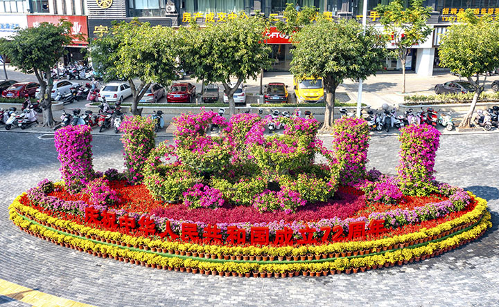 在长征大道上的天际华庭小区外面摆放了喜迎国庆三角梅绿雕,使用了盆景三角梅和造型三角梅展现了别具一格的园林景观,给市民带来一场惊艳的视觉盛宴。