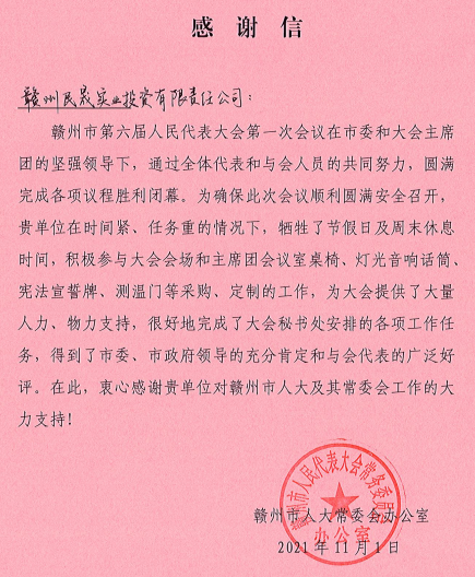 这次圆满完成市“两会”会务保障工作,并获得市人大、市政协感谢信表扬,是对集团上下讲政治、讲担当、讲大局的认可与褒奖。第三届世界赣商大会召开在即,大会开幕式将在赣州大剧院举办,民晟实业公司等相关单位将再接再厉,热情服务好各界宾朋,充分展示新时代国企的担当作为。
