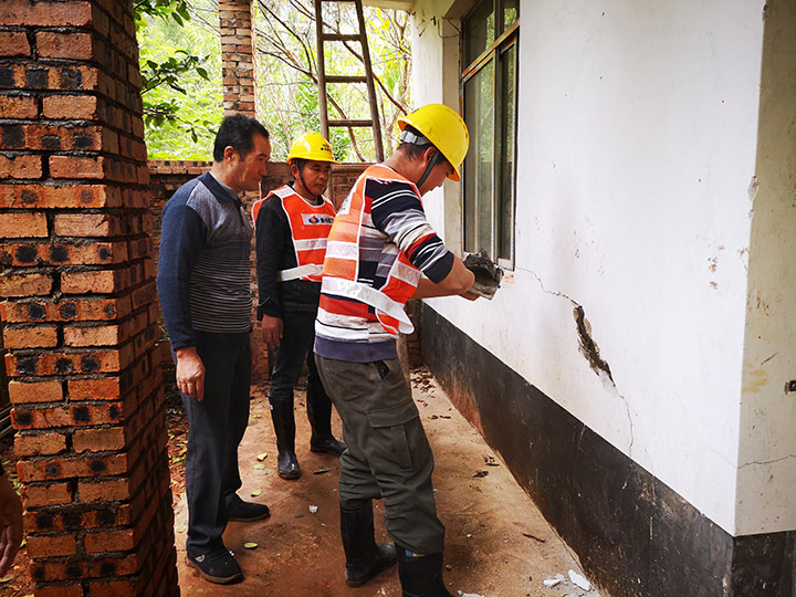收到群众诉求后,赣州建工集团党支部明确责任分工,由赣州建工集团驻蓉江花园(四区)项目部的工作人员前往实地了解情况。该村村民邱家飞年近七旬,所居住的房屋因年久失修,导致门厅墙面破损,房屋内外均存在一定程度的裂缝。此外,村里另有一对姐弟居住的房屋由于结构问题也存在几处裂缝。