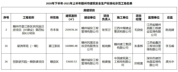 日前,赣州市住房和城乡建设局公布了2020年下半年-2021年上半年赣州市建筑安全生产标准化示范工地名单,由赣州城投集团建设的赣州市章江新区农民返迁房项目(BT建设)第四标段K22地块、星洲萃苑(一期)、中科院赣江创新研究院一期新建项目共3个项目获奖。