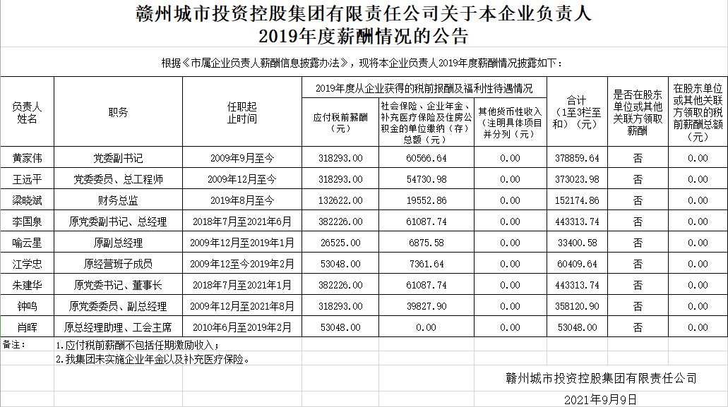 赣州城市投资控股集团有限责任公司关于本企业负责人2019年度薪酬情况的公告